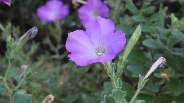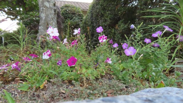 昨年の夏、確かにここに鉢植えのサフィニアをしばらく置いていたけど植えてはいないし、昨年鉢植えしたサフィニアの色とも違う。