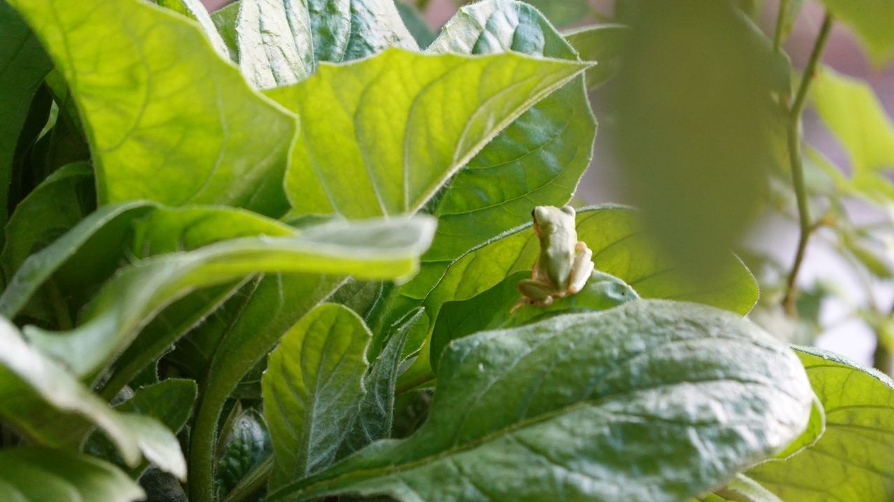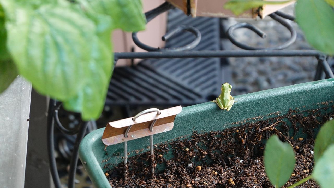 薔薇に水やりをするとカエルちゃんたちがぴょこぴょこ出てきます。