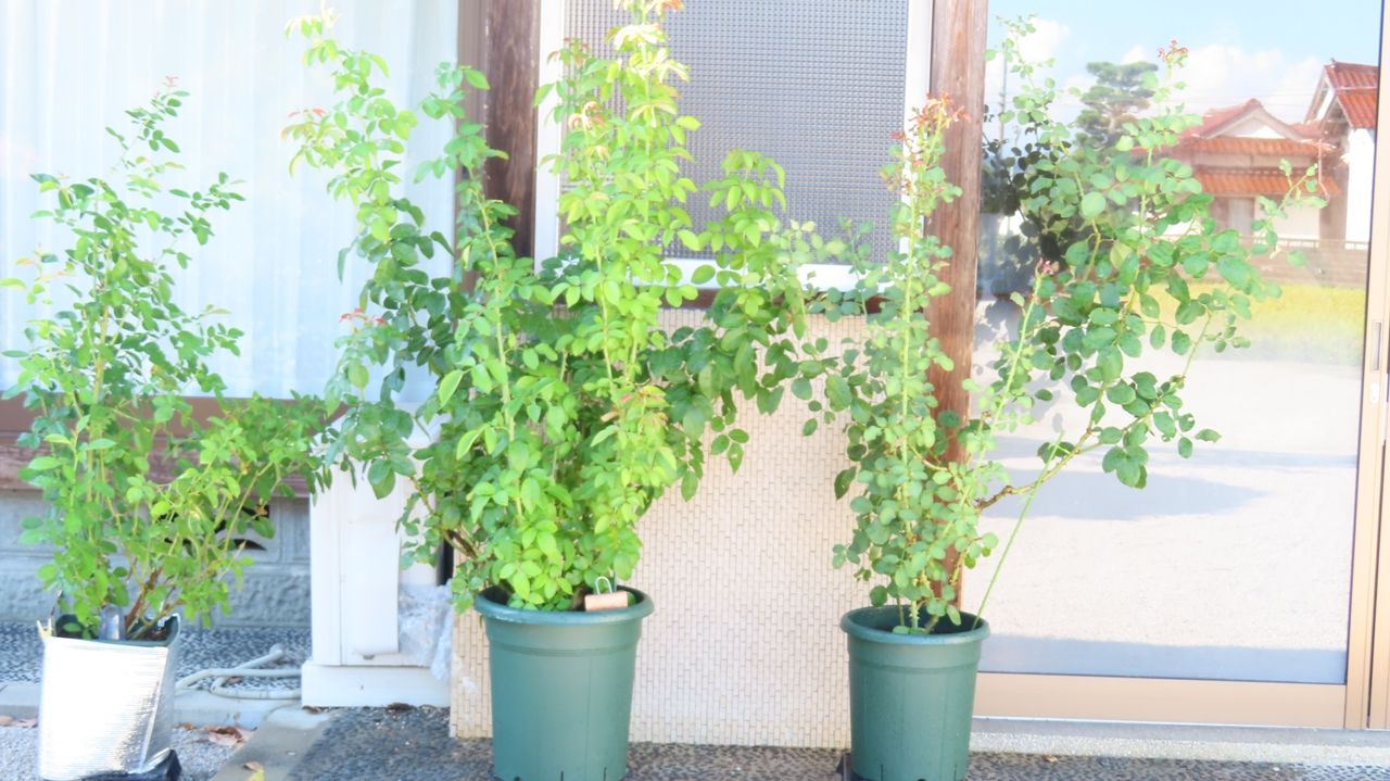 向かって左から鉢植えのラ・パリジェンヌ、フラゴナール、ベルサイユのばら。