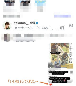 インスタのストーリでたくおんさんをメンションしたら「いいね」押してくれた~❤️