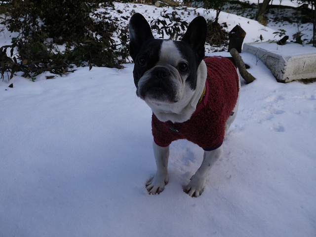 やっとあきらめて雪の上に一歩を踏み出した大左エ門