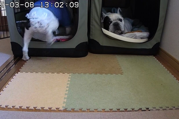 まだお留守番中も湯たんぽをクレートに入れているので、2ぶひとも
