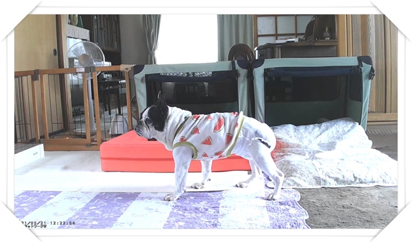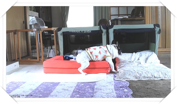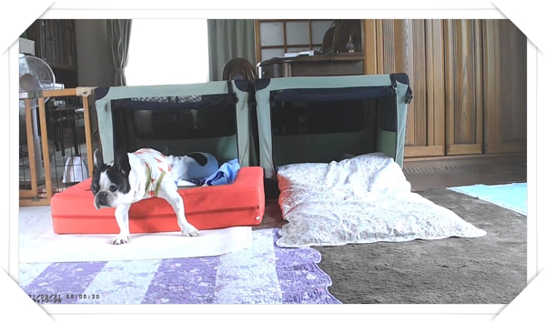 最近、ふうさんがぐーすか寝ていても大左エ門の目がパチクリと開いていることは、ままあるのだけど、カメラチェックするたびにクレートを出ていたのだ。