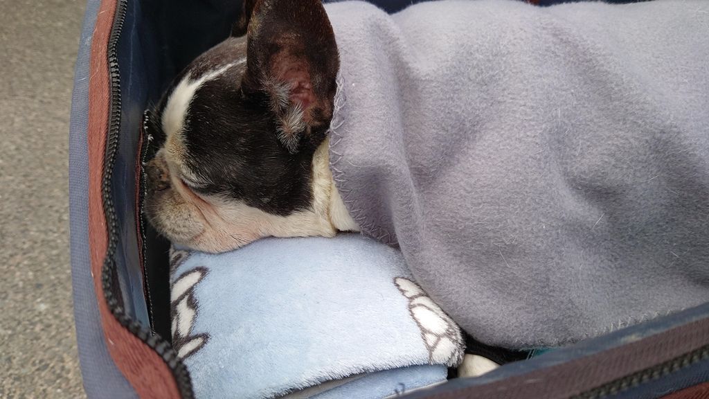 大左エ門は、一度カートのふちにアゴを乗せて外を眺めていたけど、すぐに伏せて寝ながらの散歩。